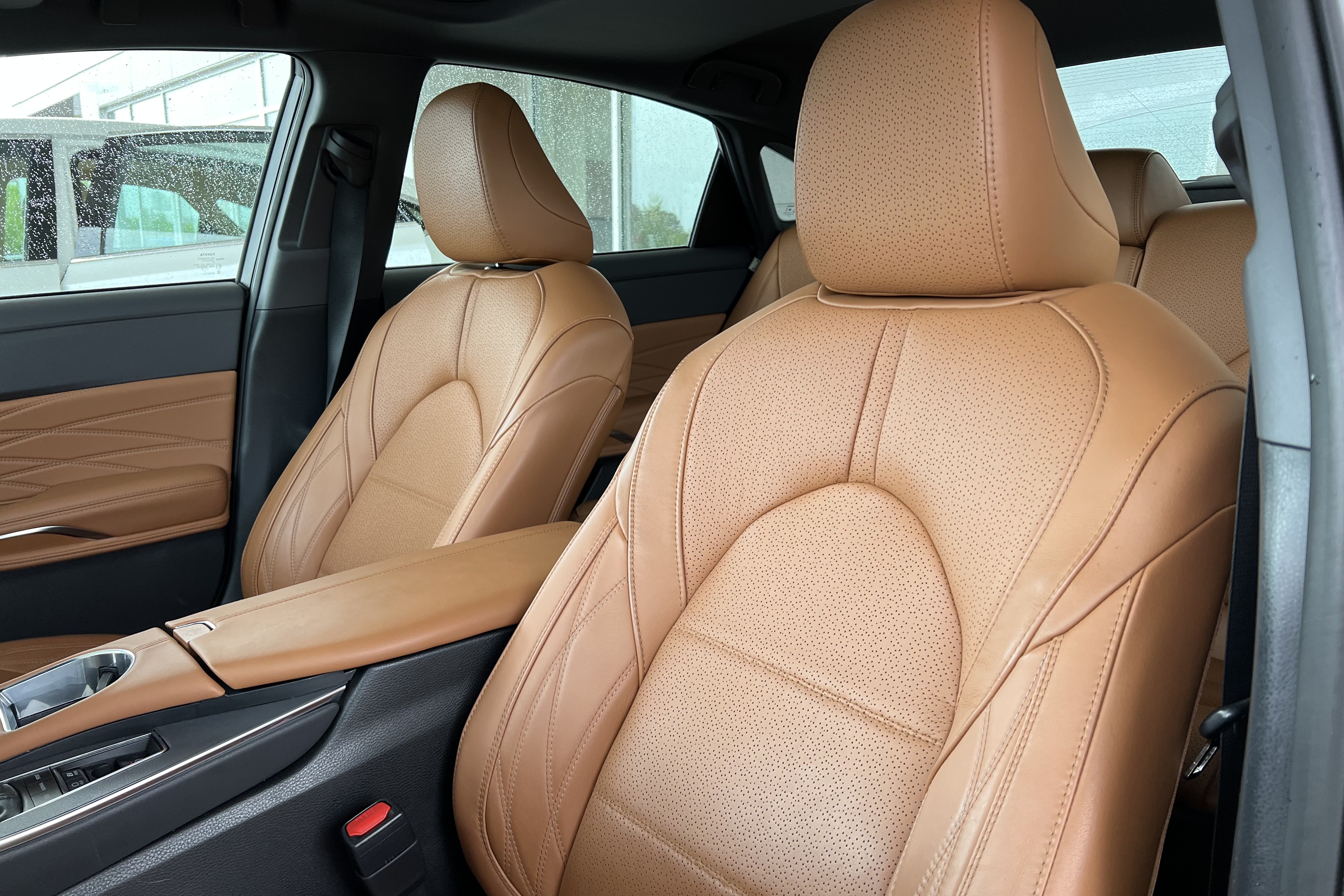Stepping inside the Cognac interior, you would be forgiven for thinking you were in a Lexus. There are a few cheaper materials in places you won’t really notice, but all the touch points are nice, and the design and material quality is top notch for the price. A diamond pattern with decorative stitching and open-pore (fake) wood trim adorn the door panels; the seats and steering wheel are covered in gorgeous perforated leather. I’m curious how well the colored leather on the wheel is going to hold up over time, but for now it looks and feels phenomenal.
