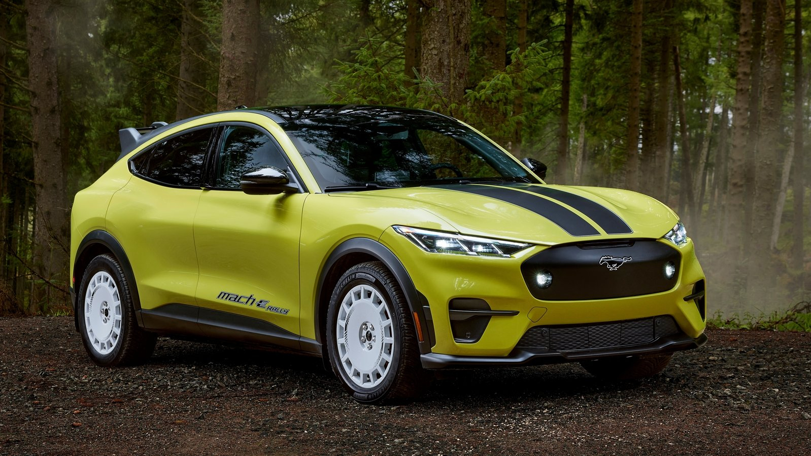 Ford engineers built a dedicated rally course at their Michigan proving grounds specifically for the development of this new Mach-E variant. MagneRide shocks, specially-tuned springs, an 0.8 inch lift, and RallySport drive mode are among the list of off-road focused kit. Additional shielding around the front and rear electric motors will help protect from drivetrain damage, and unlike the regular Mach-E, the Rally adds a front recovery point.