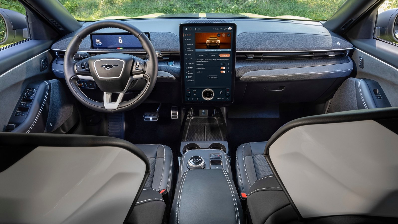 Inside, you’ll find unique seats with gloss white painted trim, which carries over to the steering wheel as well. Feature content is similar to other Mach-Es, including the latest BlueCruise 1.3 driver assist system.