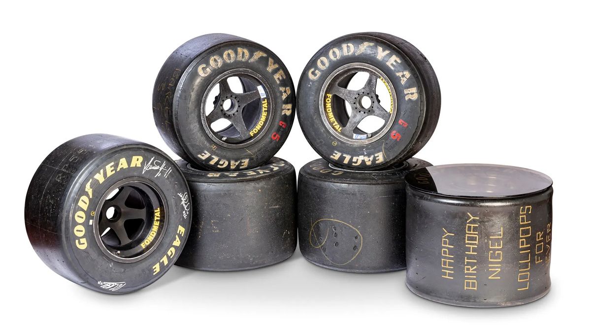 If you prefer Williams memorabilia, there’s no shortage of that either. As previously mentioned, several racing suits are on offer, but the most unique is a set of six wheels and tires from an F1 car, one of which is signed, “Happy birthday Nigel, lollipops for ever.” No further explanation is provided, or frankly needed.