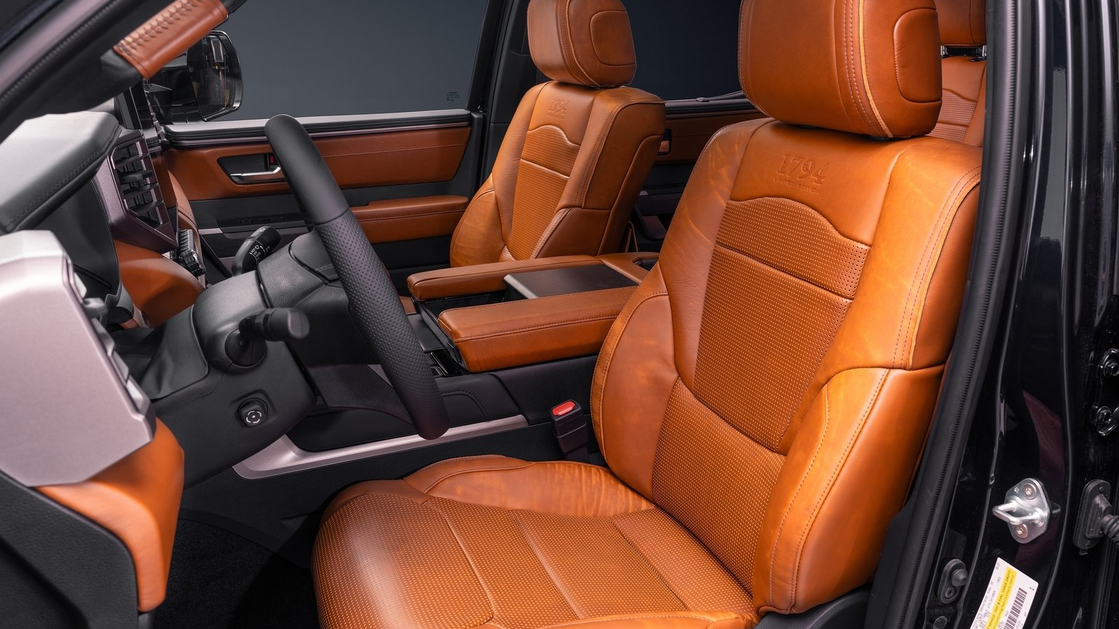 Fittingly introduced at the State Fair of Texas, the 1794 Limited adds gorgeous tan leather to almost every non-metal or plastic surface within the truck. On top of that, the front seatbacks feature saddle bags with functional flaps and buckles. Buyers also receive a few matching accessories from the Saddleback Leather Company, with which Toyota collaborated to source the leather, including an overnight luggage bag, tool roll, owner’s portfolio, and key fob pouch. All of the accessories have embossing that matches the specific truck’s production number.