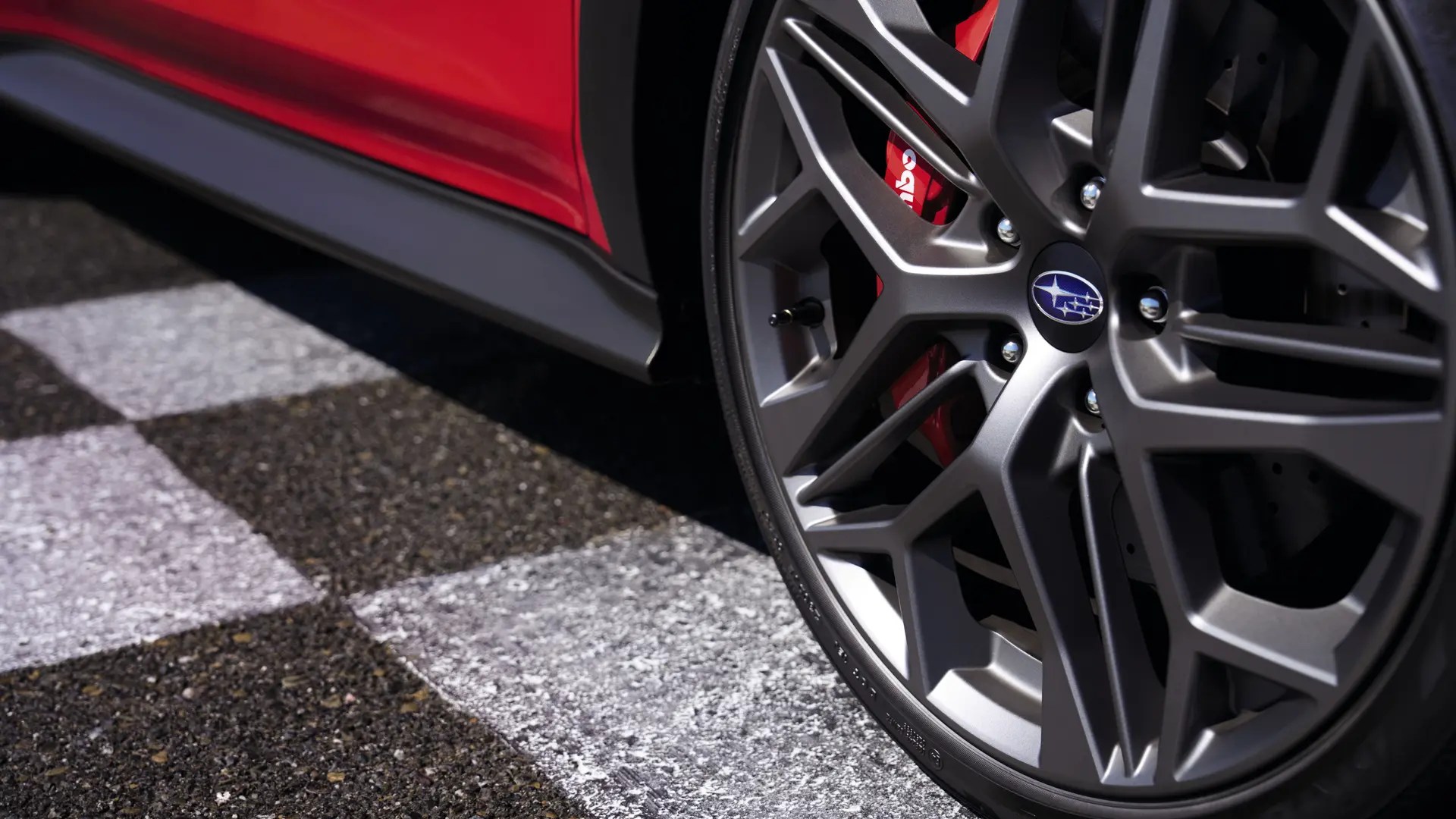 Up front, the standard brakes have been replaced by six-piston Brembo calipers (with two-piston in the rear) as well as larger pads, rotors, and a larger brake master cylinder. The springs are stiffer, and the damping rates have been recalibrated. With the addition of a retuned steering rack, Subaru says the TR has significantly better body control and steering response, while still maintaining ride quality. Satin grey alloy wheels wrapped in 245/35/R19 Bridgestone tires round out the handling upgrades.