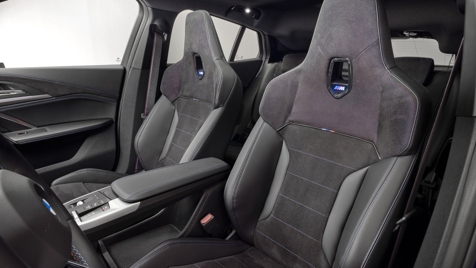 In contrast to the exterior, the X2 is very clearly based on the X1 when you step inside. The focal points of the dashboard are the infotainment and gauge cluster displays integrated together under a single curved piece of glass, as well as the unique air vent layout. The M35i version features alcantara-clad seats with light-up M logos, large paddle shifters, and a red 12-o’clock marker on the steering wheel. Non-M Sport models will come standard with vinyl upholstery which BMW proudly calls “animal-free Veganza.”