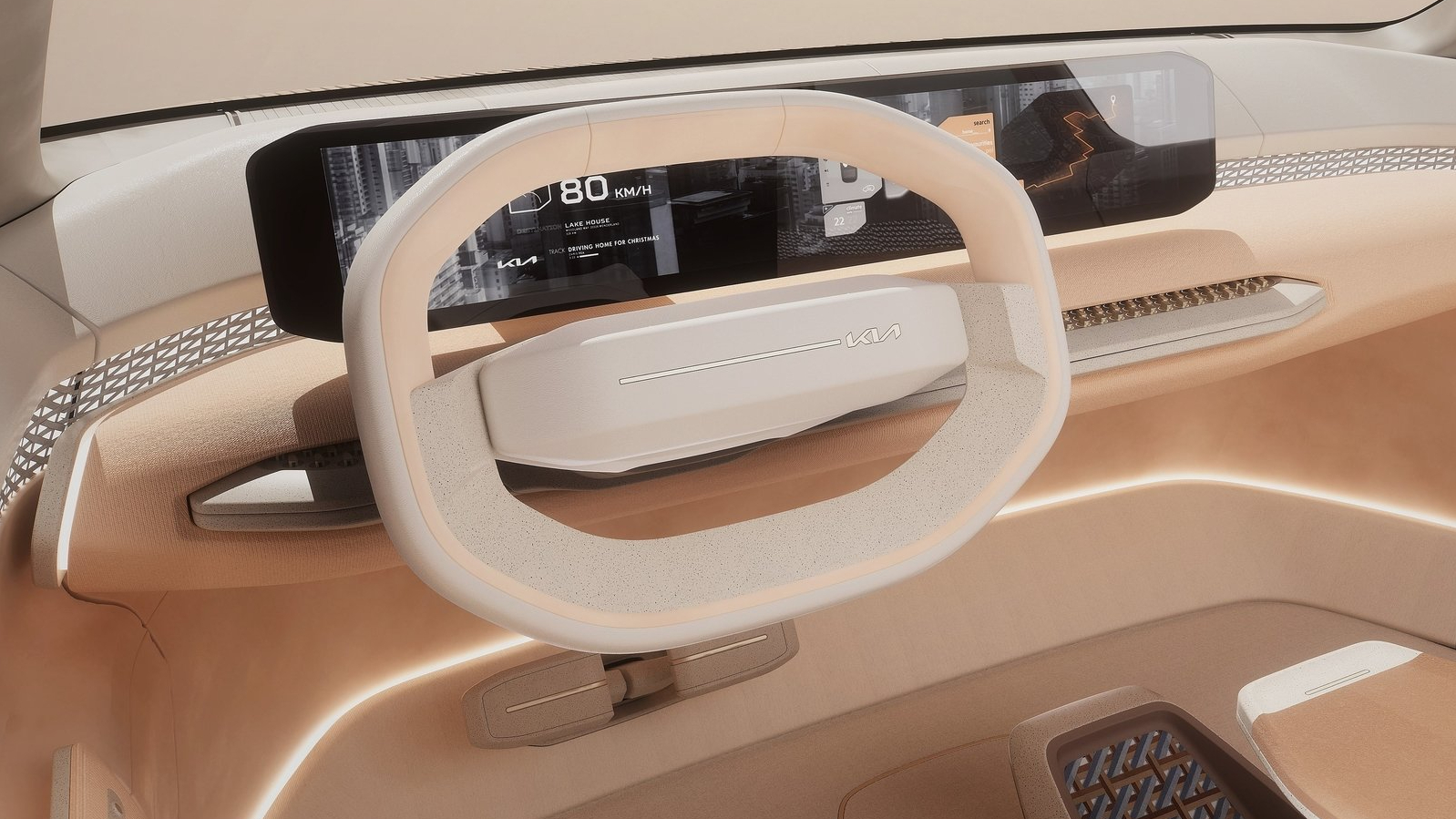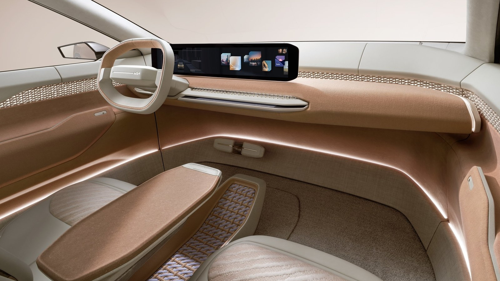 The interior design is also remarkably similar to the EV3, with thin seats, a two-spoke steering wheel, the same over-engineered climate vents with tiny individual jets, and what appear to be side-hinged pedals. The cabin space is once again super minimalist, light, and airy, as well as completely leather-free (as Kia says all of their future electric vehicles will be.)