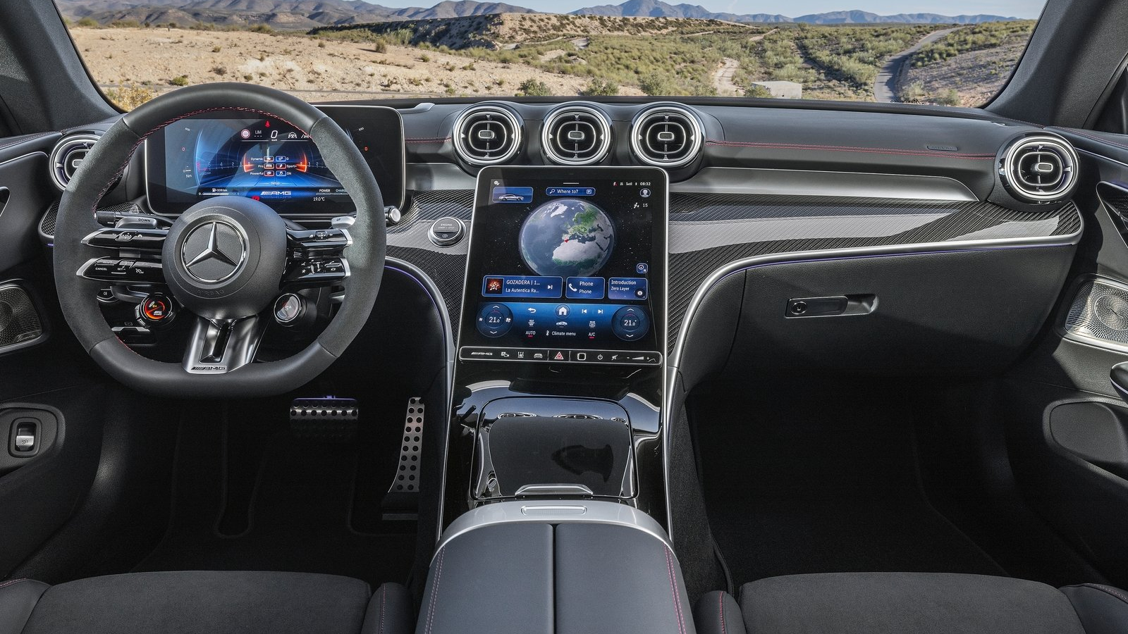 The interior is typical Mercedes fare at the moment, with a 12.3-inch digital gauge cluster and vertically-oriented 11.9-inch infotainment display. The seats are covered in MB-Tex and microfiber upholstery as standard, with the option to upgrade to Nappa leather with embossed AMG crests in the front headrests. Further upgraded AMG Performance Seats swap the standard buckets for ones with more pronounced bolsters.