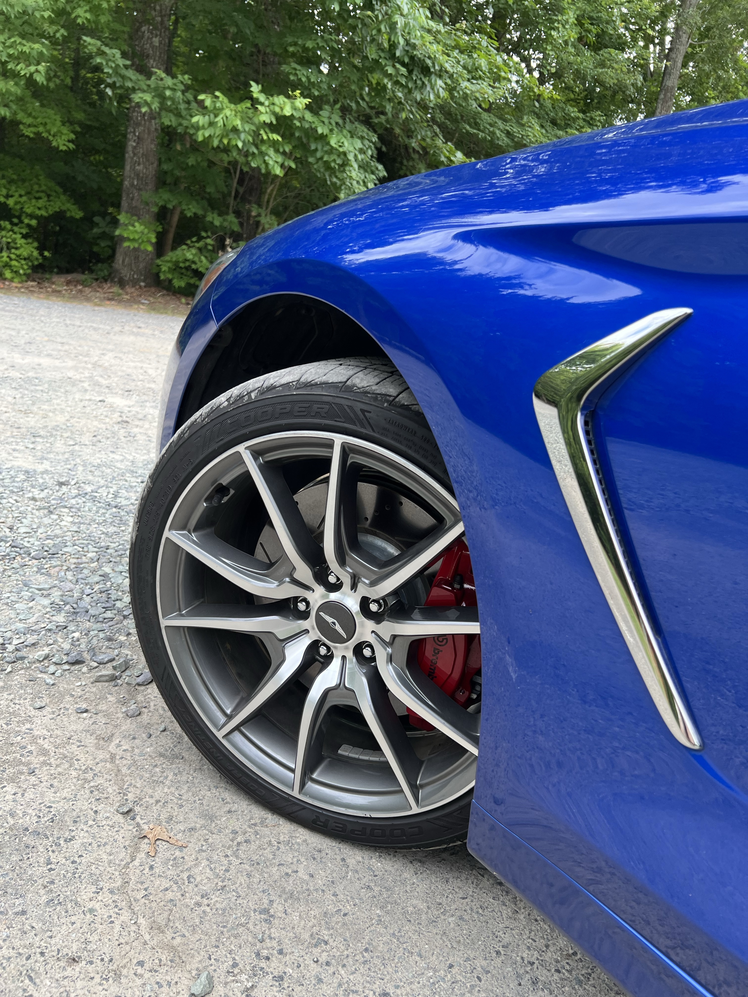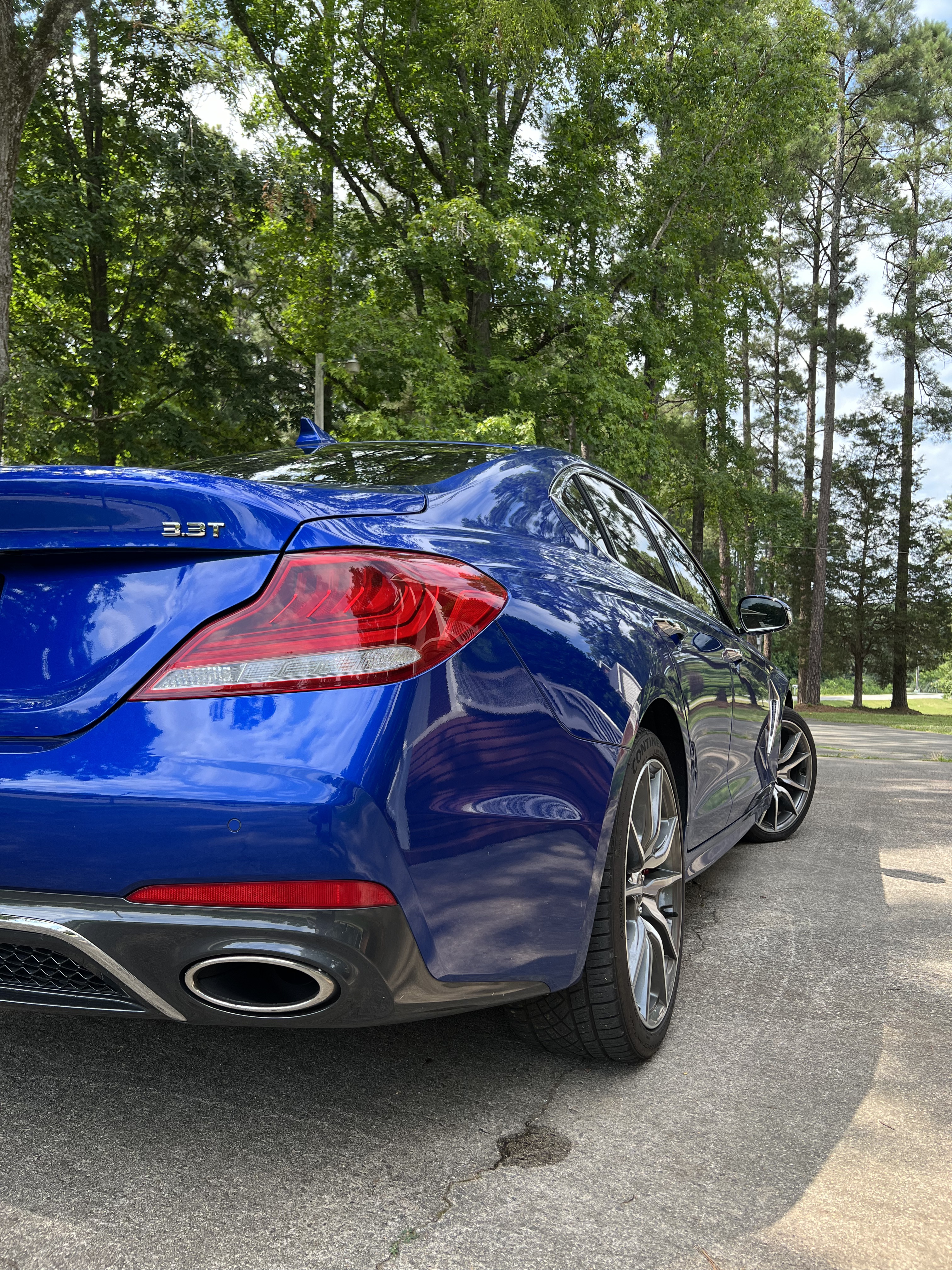 In between the two fascias, however, the pre-facelift G70 3.3T sits on either diamond-cut or dark grey 19-inch wheels, depending on trim. Either wheel design comes on a staggered tire setup from factory, with 225s in the front and 255s in the rear. Interestingly, this setup remains the same regardless of whether you opt for all-wheel-drive or the standard rear-wheel-drive as in this particular car. (The entry-level G70 2.0T does have smaller 18-inch wheels on 225s as standard.)