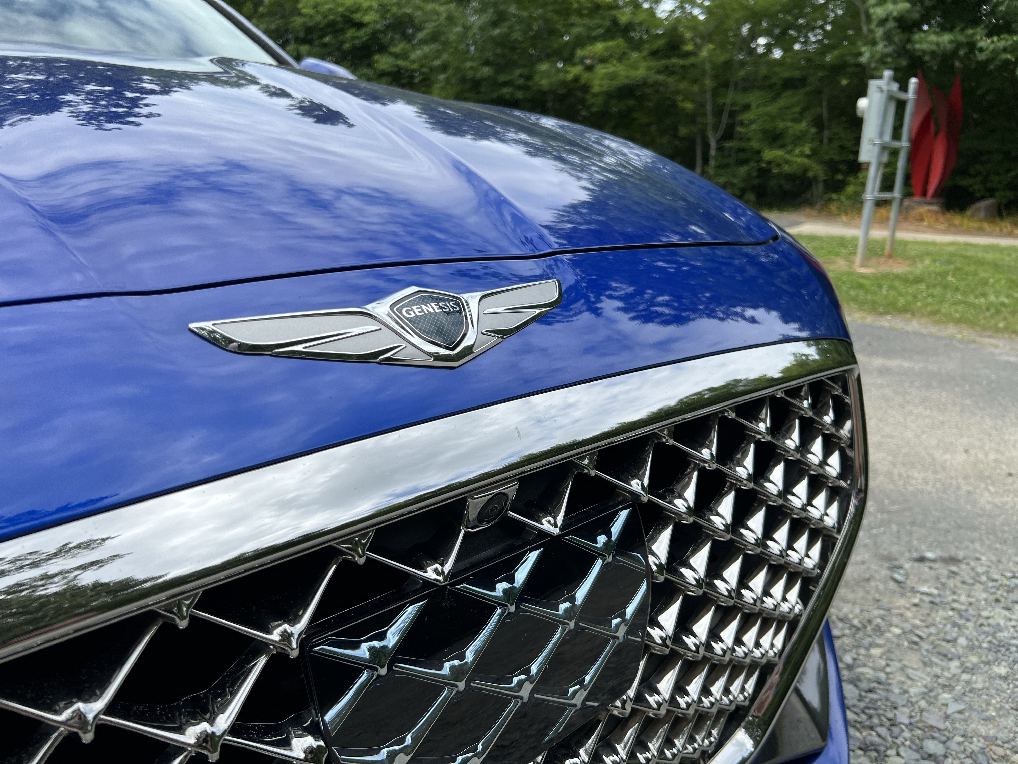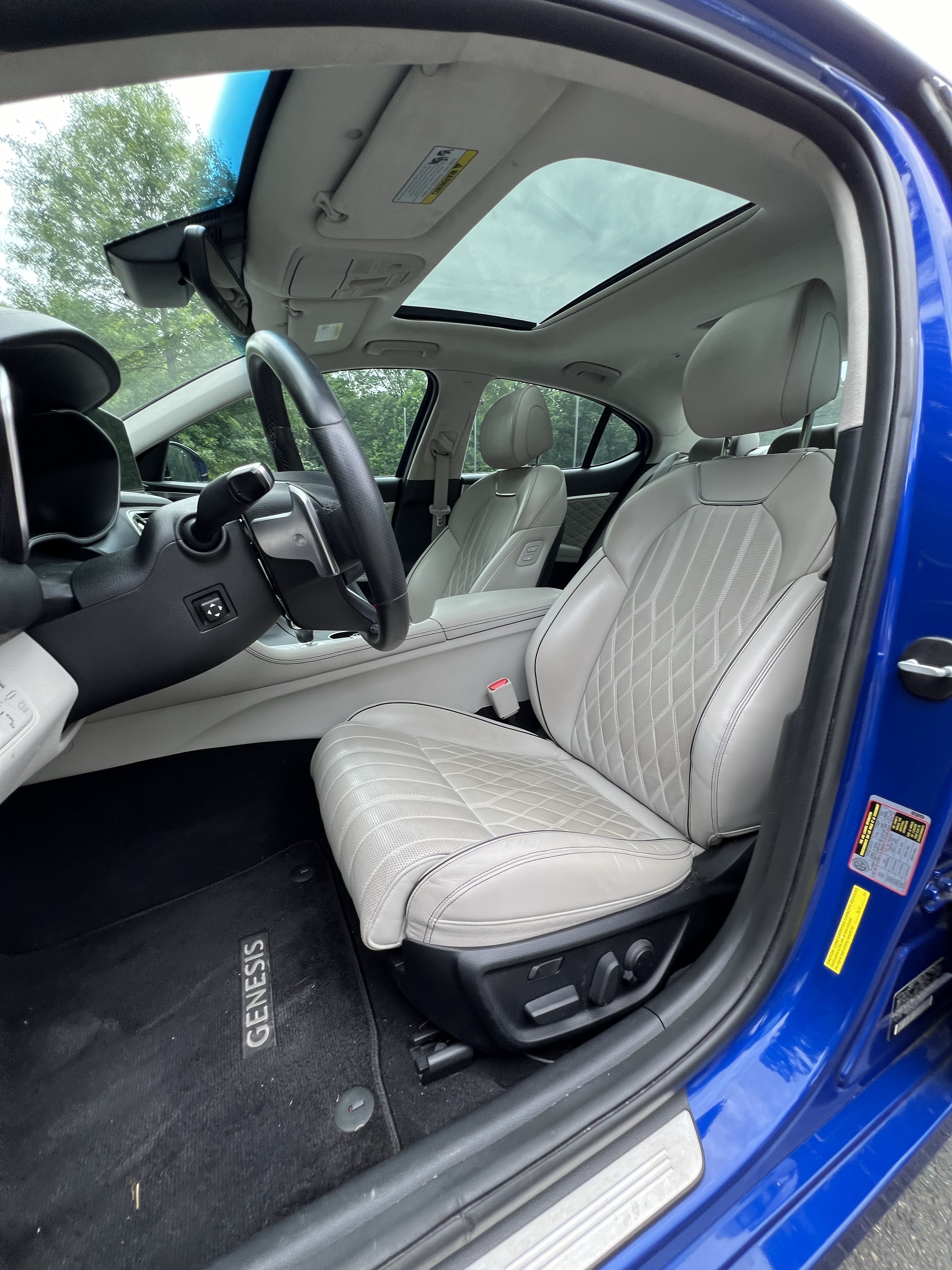 For one, the G70 is gorgeous to look at. Finished in Mallorca Blue, it’s a stunning sedan from almost any angle. The proportions are good, and the whole exterior is a nice blend of elegance and sharper lines. Up front, you’ll find a decidedly Audi-shaped grille and full LED headlights. The radar sensor isn’t particularly well integrated, but at least they tried. The rear end is probably the only weak point of the entire design — it’s just a bit bland, and doesn’t look as special as the front or side profiles would have you expect. The fake exhaust tips are disappointing (though not uncommon nowadays) and the G70 doesn’t sound particularly special either.