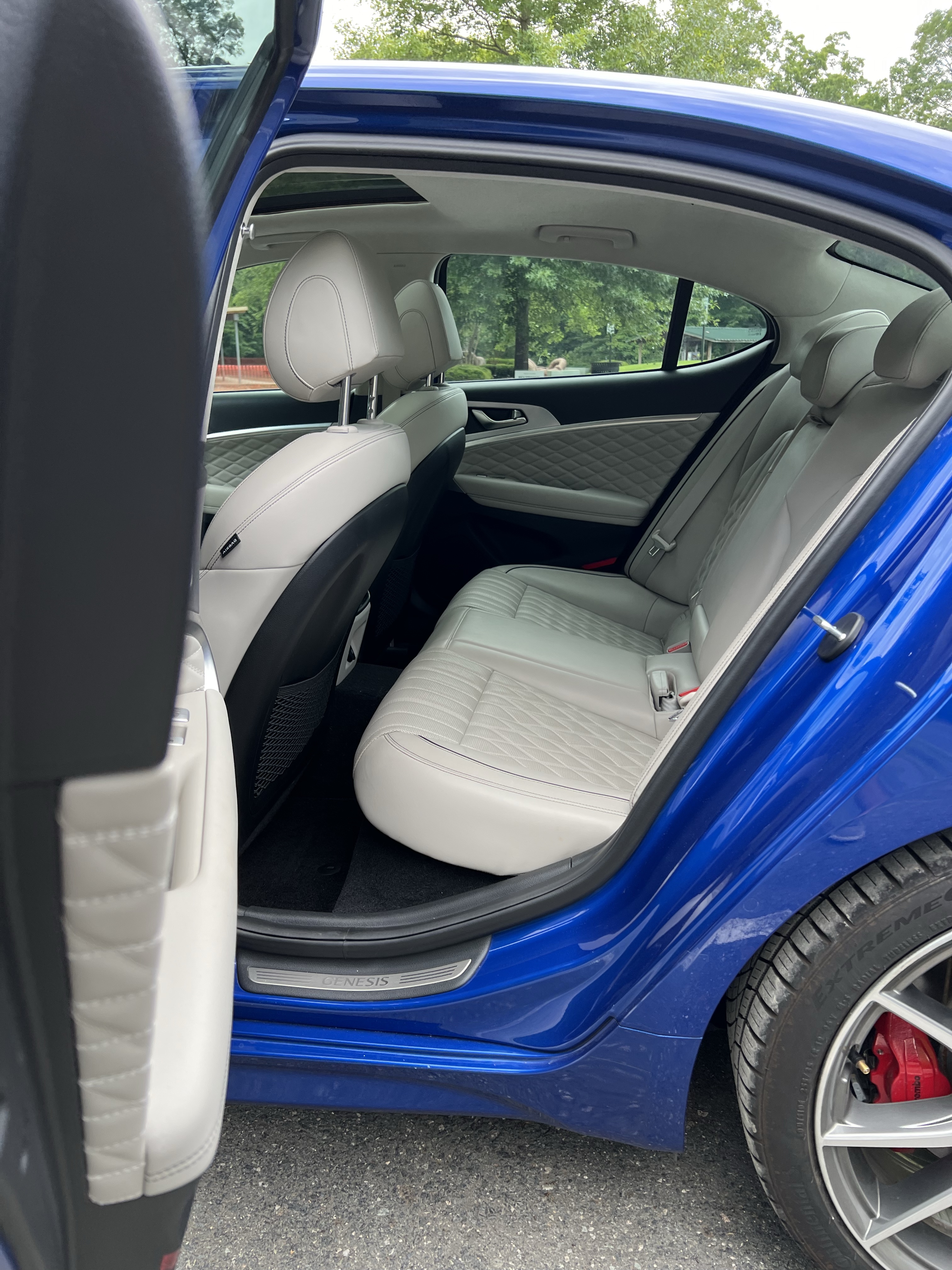 The rear seat of the G70 is a weird mix of cost cutting. There’s not a ton of legroom, and only one USB plug for passengers to share. For some reason, though, the seat cushions are heated and Genesis has included buttons on the side of the front passenger seat to allow adjustment from behind — the latter being something I’ve only ever seen in Mercedes-Maybachs and other large executive vehicles. At 10.5 cubic feet, the trunk is also one of the smallest in the segment, but also has a powered lid.
