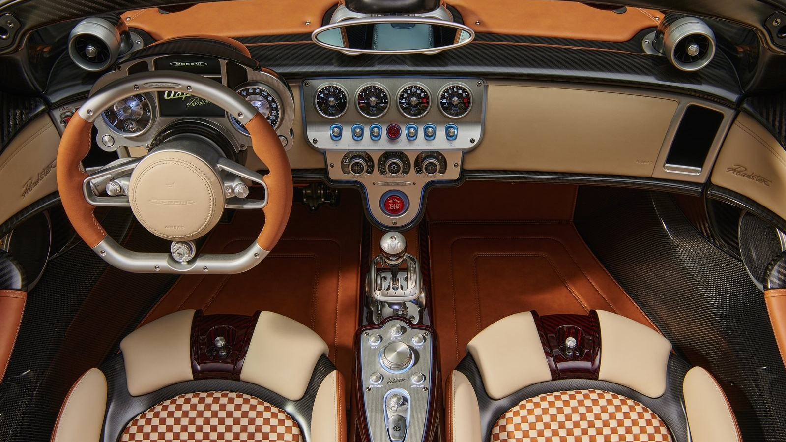 Inside, the Utopia Roadster harks back to a simpler time when the gauges and switchgear were much more analog. Besides the single digital display facing the driver (which allows access to the infotainment system and backup camera), everything else in the cabin is appropriately ornate and appears to be wonderfully tactile, from the shifter’s exposed linkage to the toggle switches on the dash to the steering wheel. Pagani says the latter actually started life as a single piece of aluminum before it was milled for 28 hours.