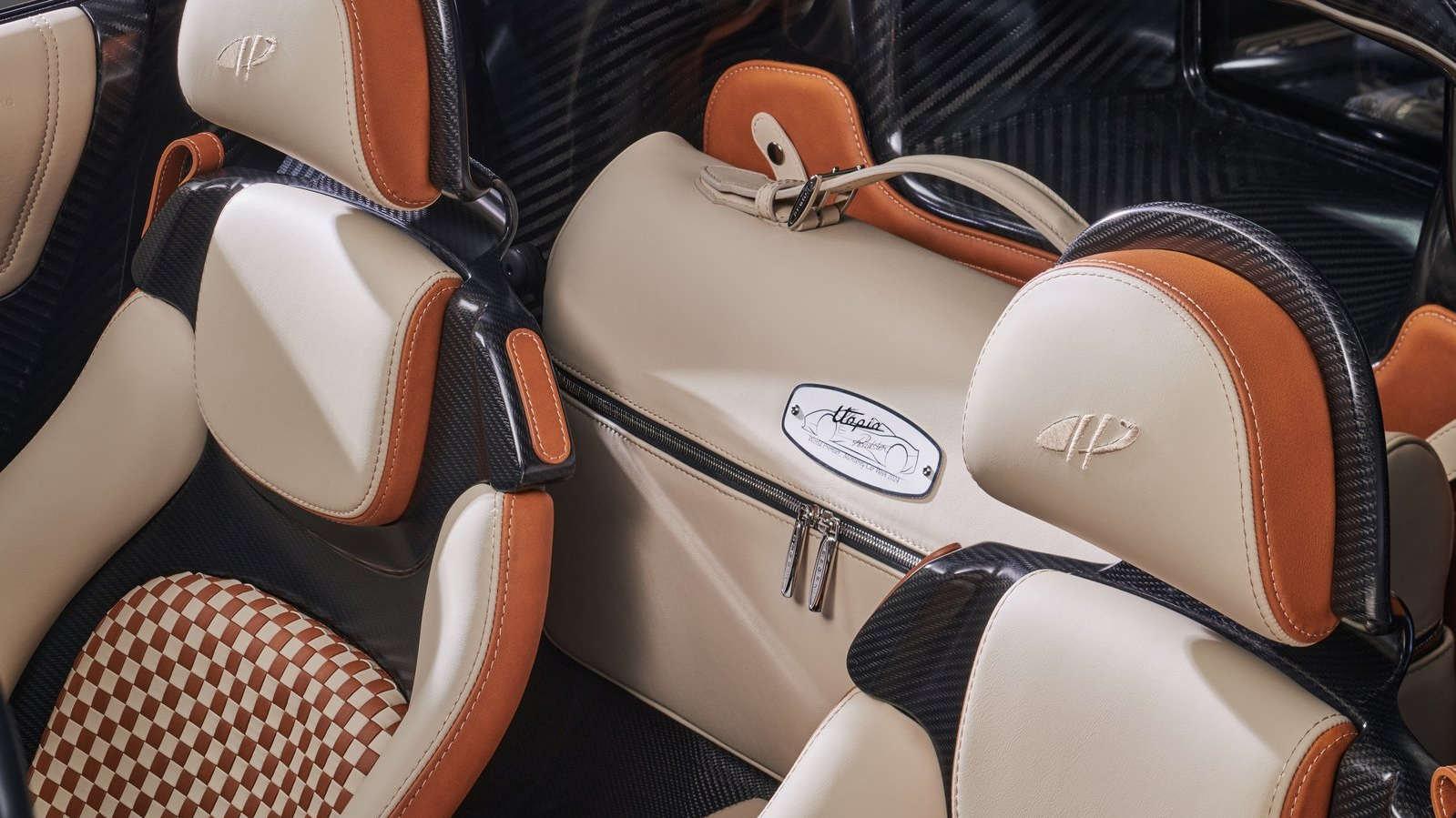 As you’d expect from a $3.4 million hypercar, personalization options are virtually limitless. The example pictured above, which is set to debut at Monterey Car Week, is painted in Habanero Red and allows the car’s carbon-fiber bodywork to show through. It’s paired with a multi-tone tan interior with swanky checkerboard seat centers and more exposed carbon fiber. The Utopia Roadster also includes a matching bag behind the seats for storing the temporary softtop roof, as well as custom suitcases that fit perfectly in the storage compartments on either side of the engine bay.