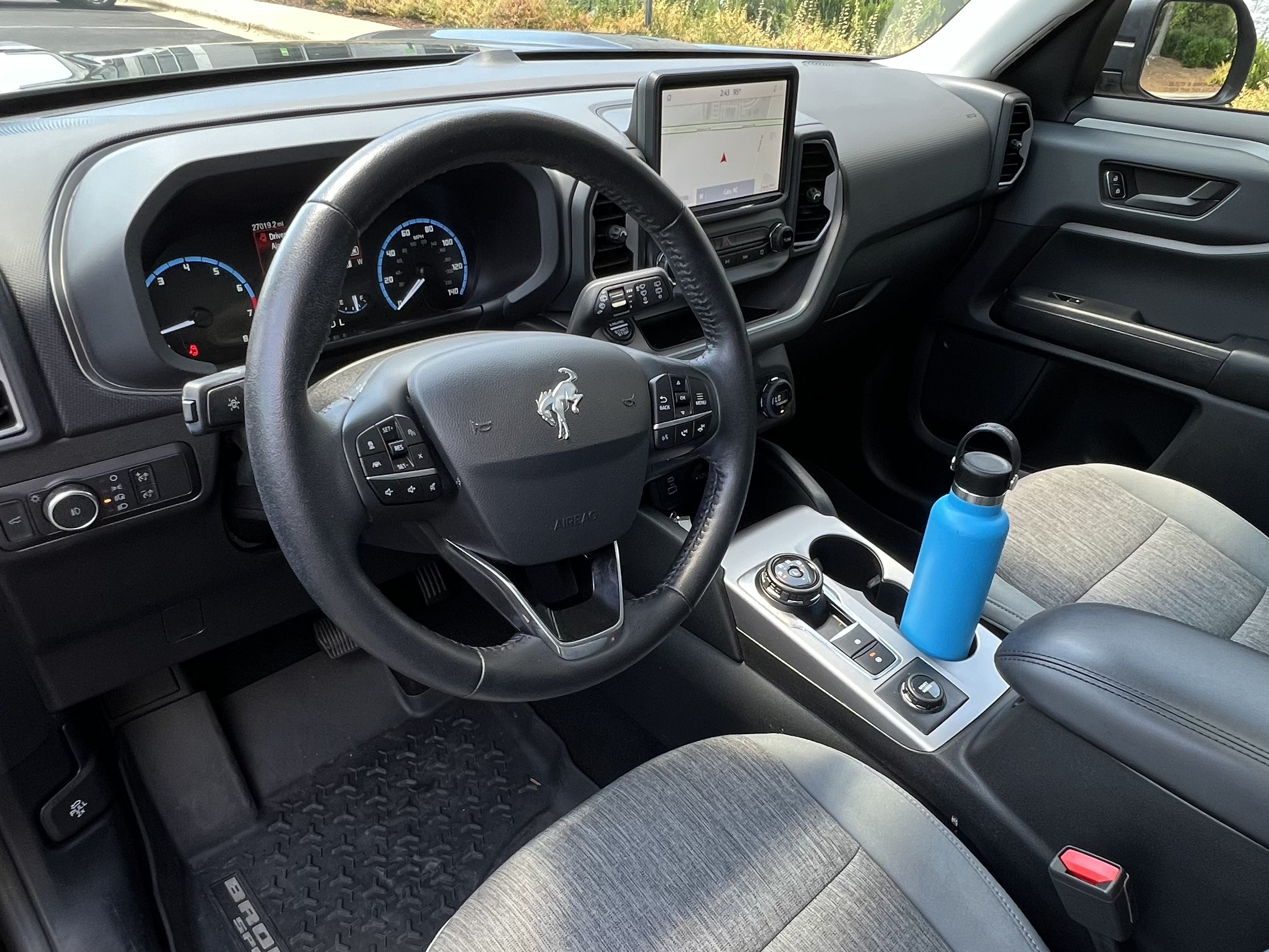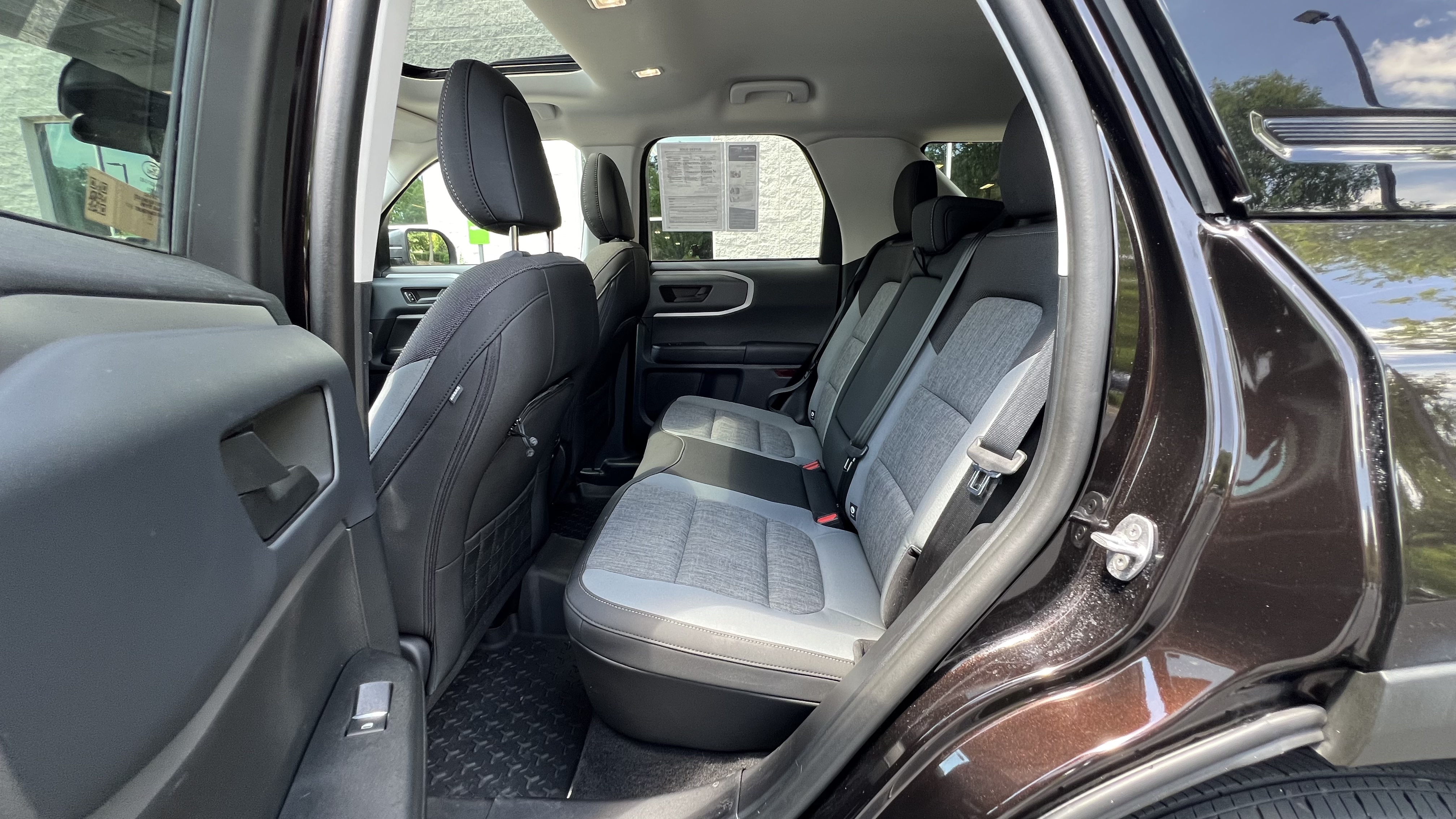 The Bronco Sport’s interior is also decidedly utilitarian, but that’s not a bad thing. Materials are generally on the less expensive side, but it’s important to remember the base Sport starts under $30,000. The leather-wrapped steering wheel feels nice and the three-tone upholstery gives the cabin some flair. The touchscreen isn’t overwhelmingly huge or sophisticated, but this version of Sync is easy to operate and I’m thankful for large physical audio and climate controls.